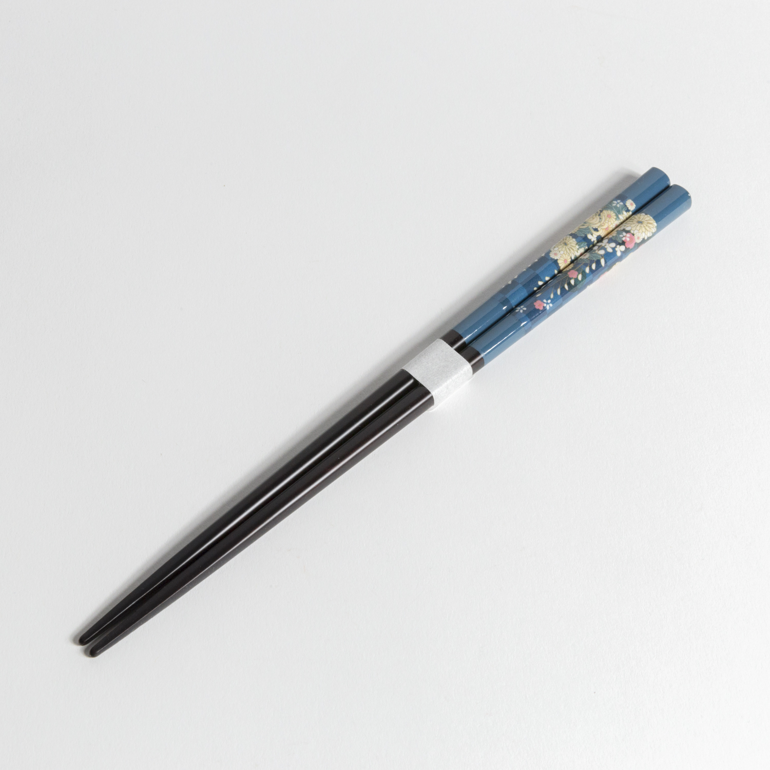 Paire de baguettes en bambou brun sombre, motif "Multifleurs" bleu.