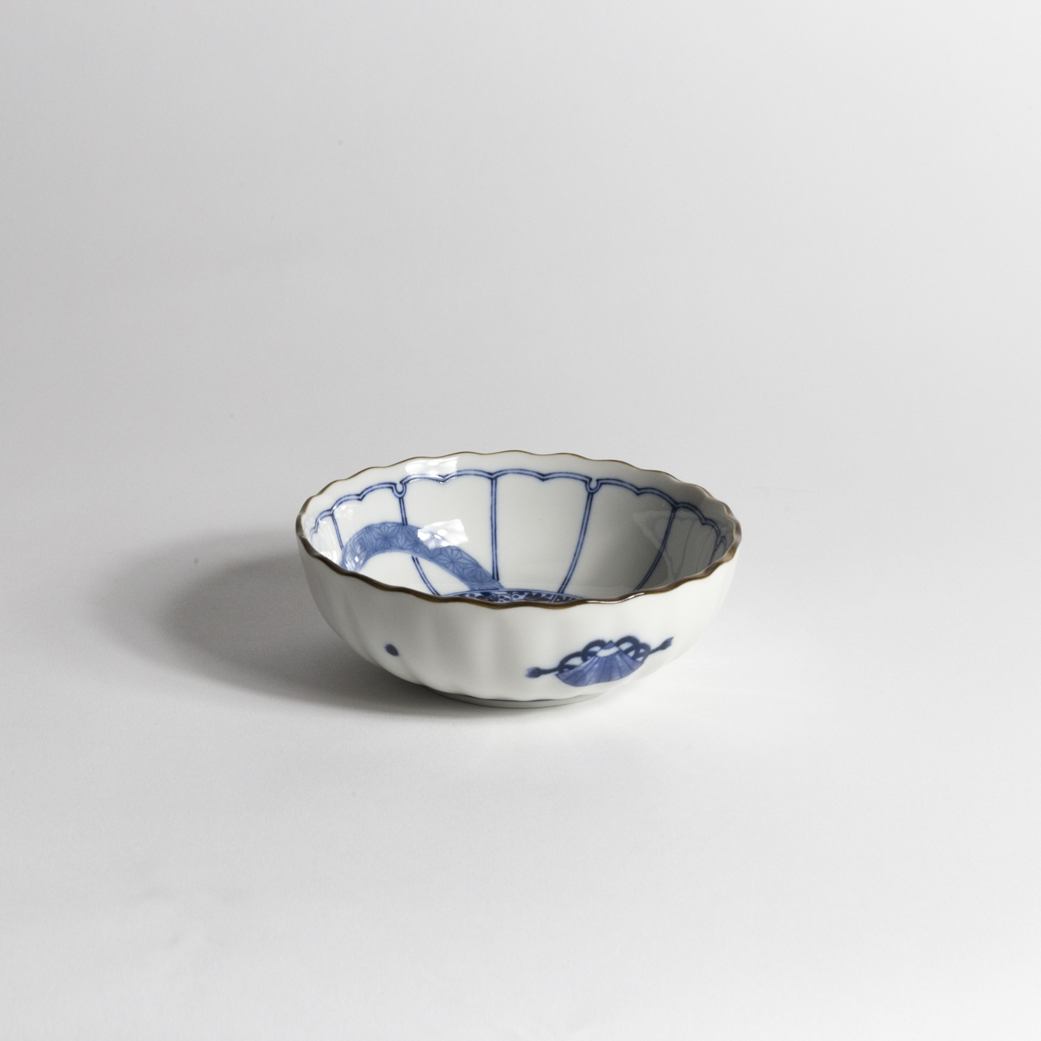 Coupe petit modèle en porcelaine blanche aux bords ondulés, motif "Aux Cercles" bleu.