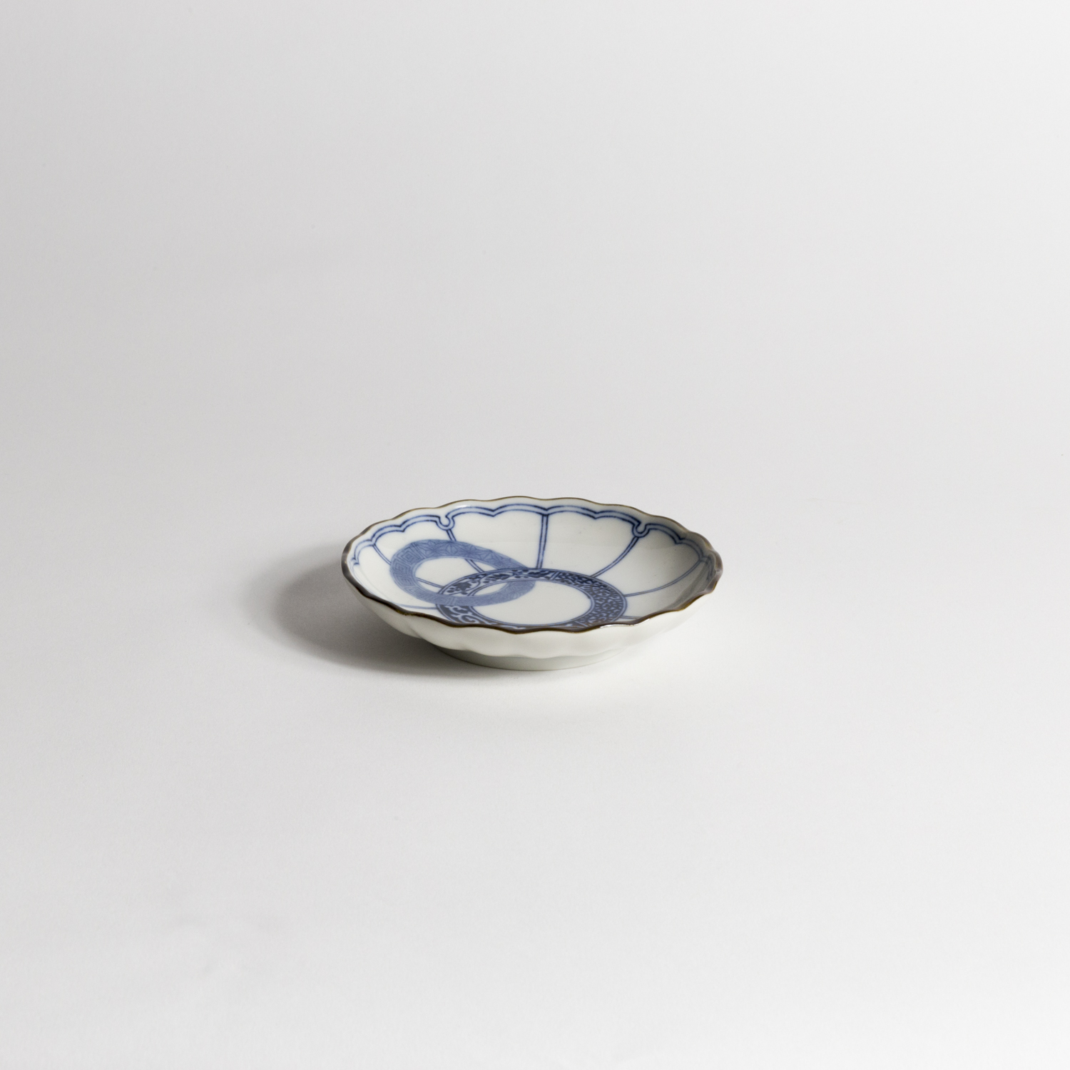 Coupelle en porcelaine blanche aux bords ondulés, motif "Aux Cercles" bleu.