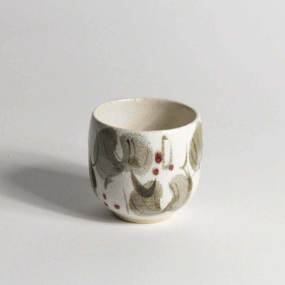 Gobelet en grès craquelé blanc, motif "Feuillage Baies" brun.