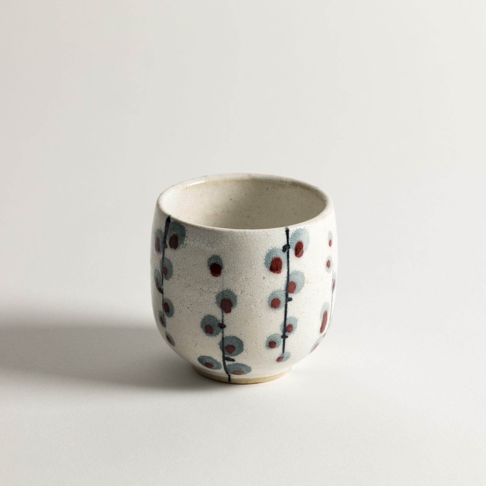 Gobelet en grès japonais blanc cassé, motif "Plumetis" bleu et rouge sombre.