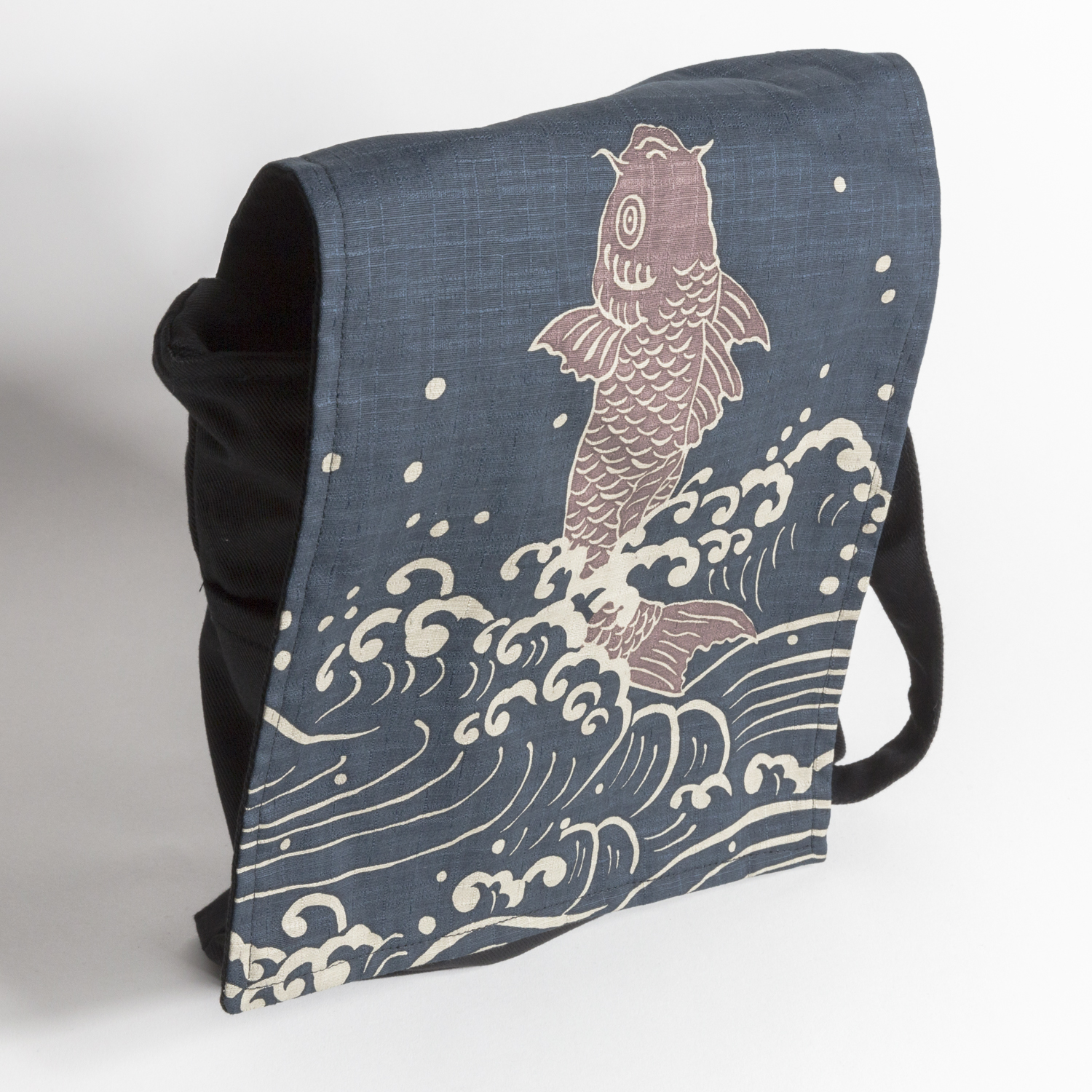 Sac en bandoulière coton bleu, motif "Koi" beige rosé. Face intérieure noire avec pochette.