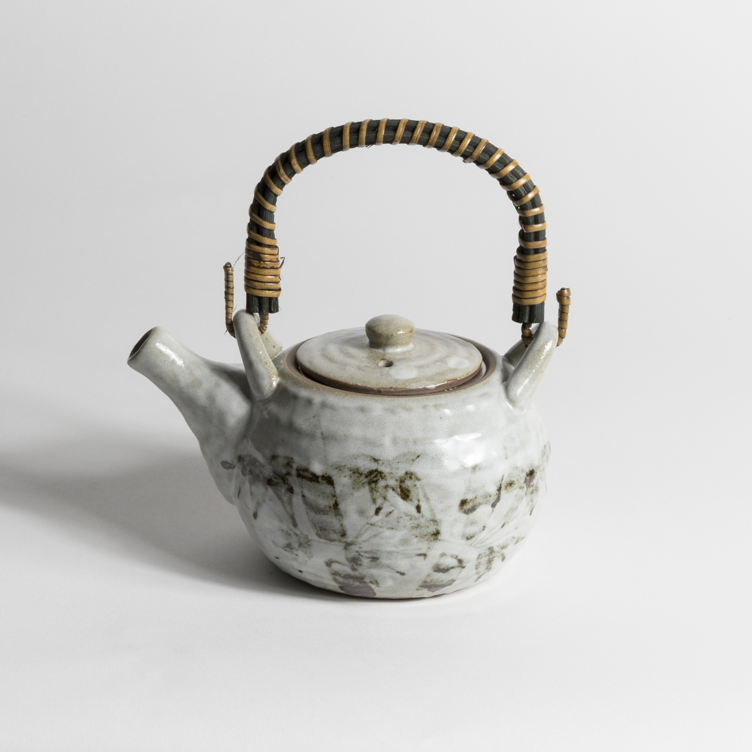 Théière en grès "matière" gris pâle "Aux Bambous", anse en bois noir et bambou tressé naturel.